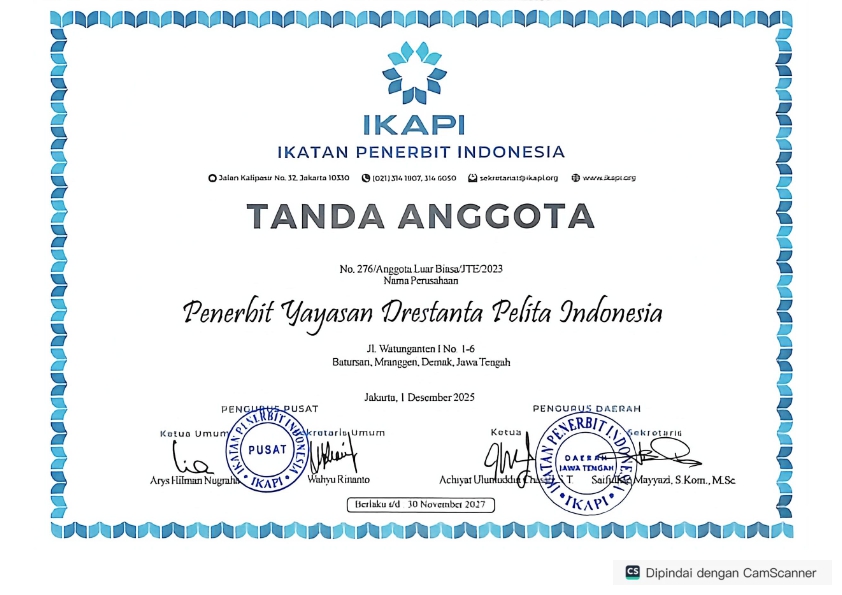 Yayasan Drestanta Pelita Indonesia adalah sebuah lembaga yang bergerak di bidang penerbitan buku ber-ISBN dan telah resmi menjadi anggota Ikatan Penerbit Indonesia (IKAPI). Yayasan ini menjalin kerjasama yang erat dengan para pengajar dan peneliti di Indonesia, memperkaya dunia literasi dan pendidikan dengan karya-karya yang berkualitas dan kredibel. Melalui komitmen yang tinggi terhadap kualitas dan pengembangan pengetahuan, Yayasan Drestanta Pelita Indonesia berupaya menjadi pilar penting dalam kemajuan literasi di tanah air
